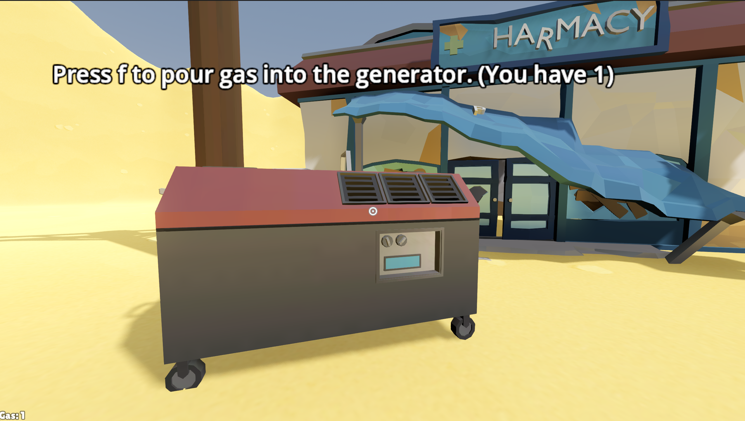 Collect the 3 jerry cans of gas and pour them into the generator to save the people in the pharmacy to win!